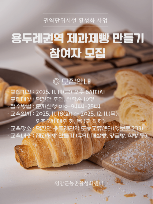 덕진면 용두레권역 제빵시설을 활용한 제과제빵만들기 주민교육을 실시합니다.일시 : 2025년 11월 18일(화) 오후 2시~5시 매주 화, 목 총 8회차장소 :..