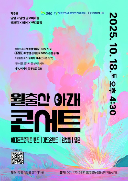 영암 달코미마을에서 ‘월출산 아래 콘서트’오는 18일, 미암 달코미마을 야외광장 백패킹×인디뮤직×로컬, 주민들 푸드존 운영영암 농촌의 가을들판 공간에서 캠핑과 ..
